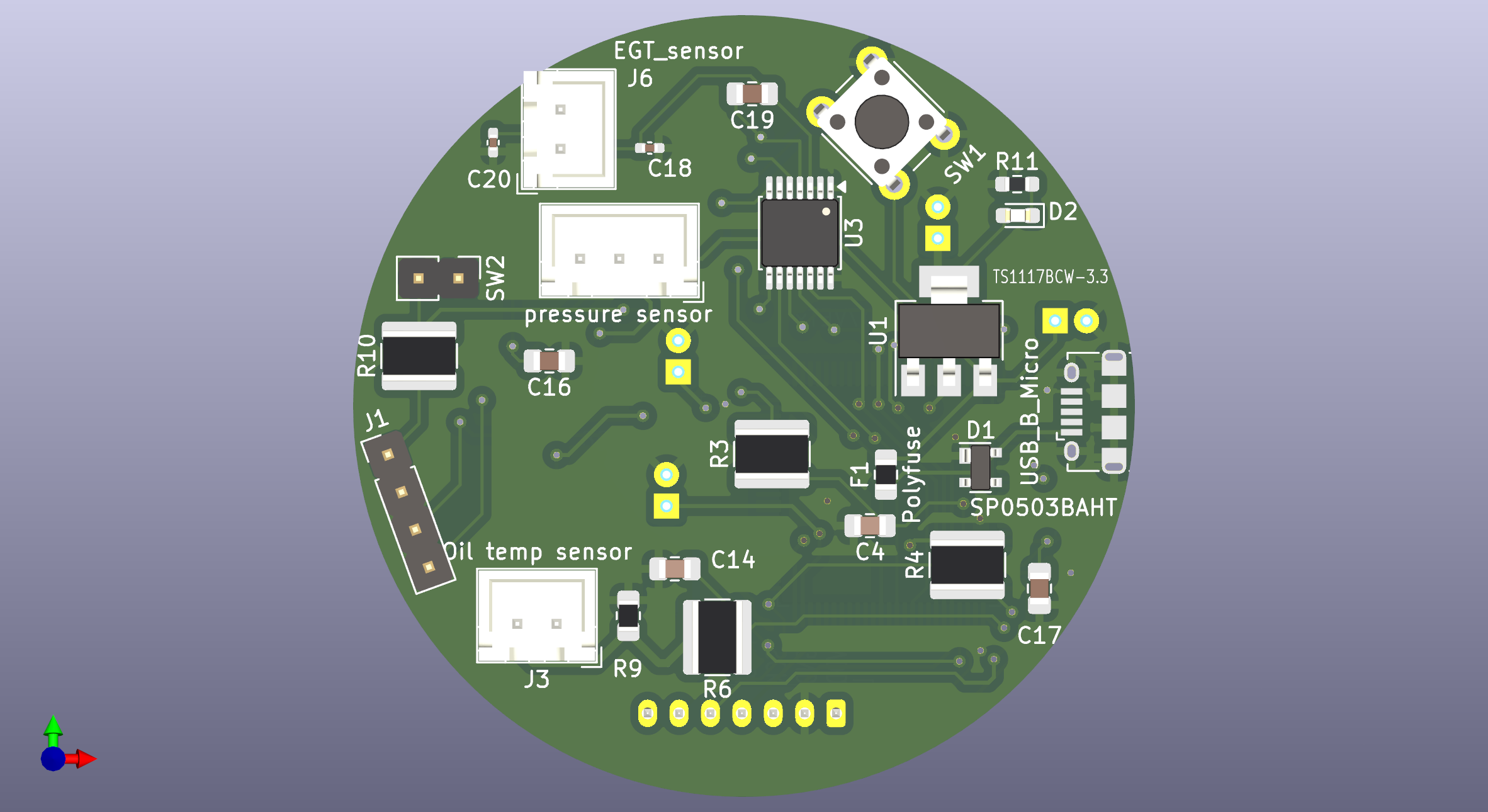 Not much to say about other design choices. It's a 4-layer PCB with signal + ground plane on top and bottom layers and a power and a ground plane on the inner layers. Sensors will be connected using JST-PH connectors due to their small size, price and availability. There's a USB Micro-B connector for power and a TS1117BCW 3.3v reg to bring it down for the microprocessor